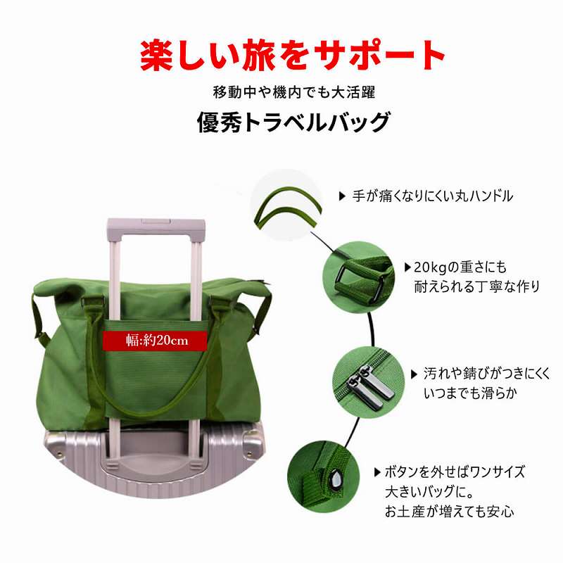 サイズ・容量ラフでおしゃれなシンプルデザイン、コーデにも合わせやすい無地トラベルバッグ撥水加工されているので、ちょっとした水濡れなどにも強いキャリーケースに取り付け可能だから、旅行のサブバッグとしても大活躍カラー:ブラック/ネイビー/ベージュ/ワインレッド/グリーン素材:表側:ナイロン/裏側:ポリエステルサイズ:高さ:約39cm 底横幅:約38cm マチ:約12cm 持ち手:約21cm重さ:約399g