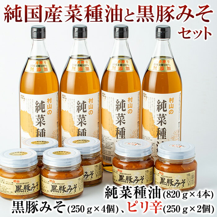 【ふるさと納税】純国産菜種油と絶品黒豚みそのセット(菜種油820g×4本、豚みそ250g×4個、豚みそピリ辛250g×2個)【村山製油】【43183】